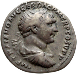 IMP TRAIAN[O] AVG GER DAC P M TR P COS V P P, Bust of Trajan seen from behind, laureate, draped, cuirassed, right