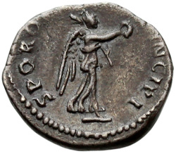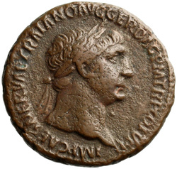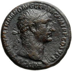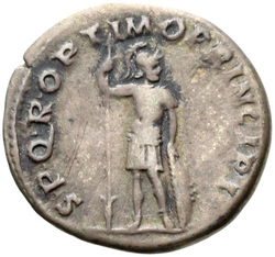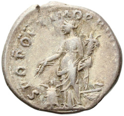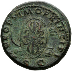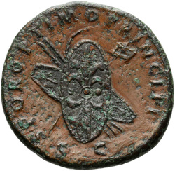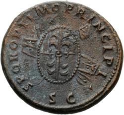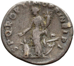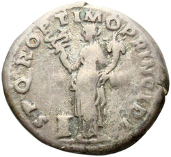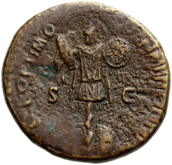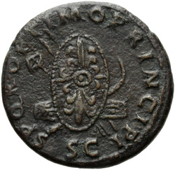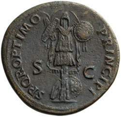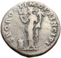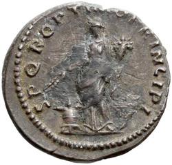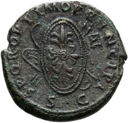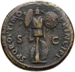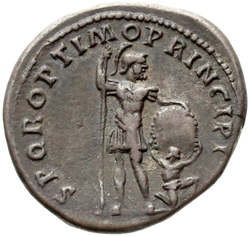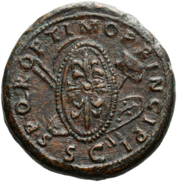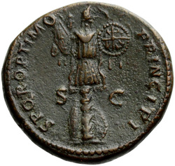 S P Q R OPTIMO PRINCIPI, Abundantia, draped, standing left, holding corn-ears downwards in right hand over modius with corn-ears, left, and cornucopiae in left hand; to right, prow of ship