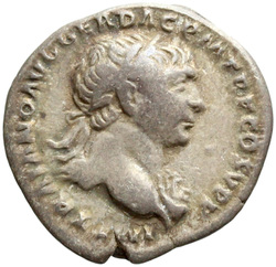 IMP TRAIAN[O] AVG GER DAC P M TR P COS V P P, Bust of Trajan seen from behind, laureate, draped, cuirassed, right