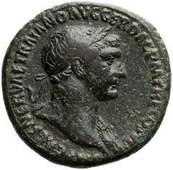 IMP TRAIAN[O] AVG GER DAC P M TR P COS V P P, Bust of Trajan seen from behind, laureate, draped, cuirassed, right