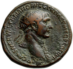 IMP TRAIAN[O] AVG GER DAC P M TR P COS V P P, Bust of Trajan seen from behind, laureate, draped, cuirassed, right