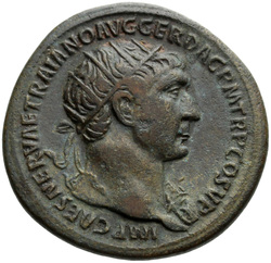 IMP TRAIAN[O] AVG GER DAC P M TR P COS V P P, Bust of Trajan seen from behind, laureate, draped, cuirassed, right