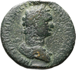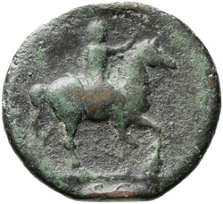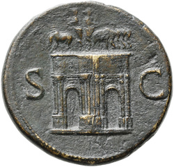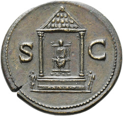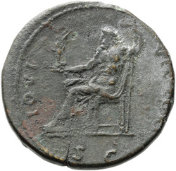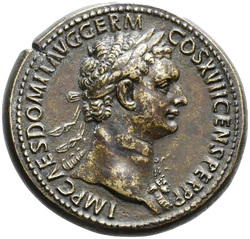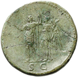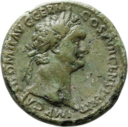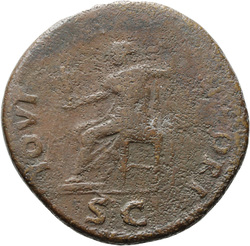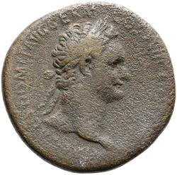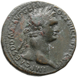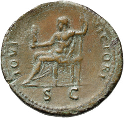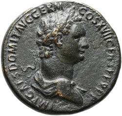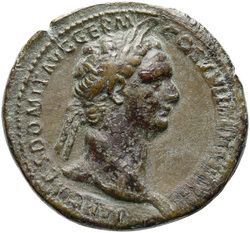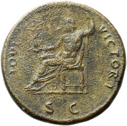 S C, Domitian, bare-headed, in military dress, standing left, holding thunderbolt in right hand and vertical spear reversed in left, being crowned by Victory, draped, standing left, holding palm upright in left hand