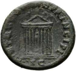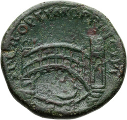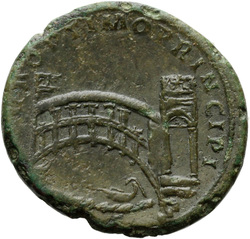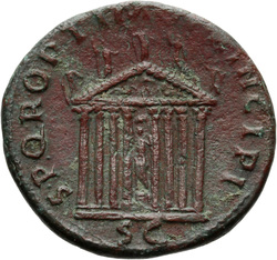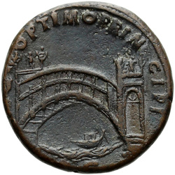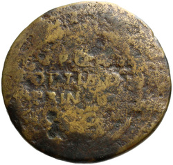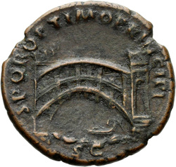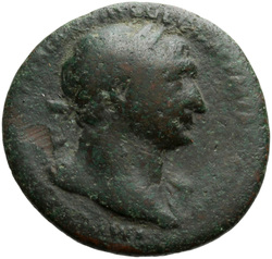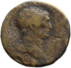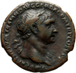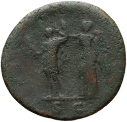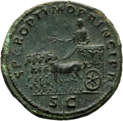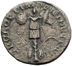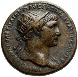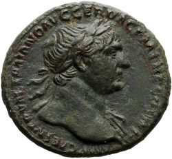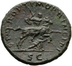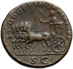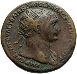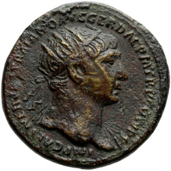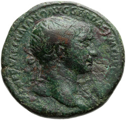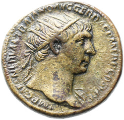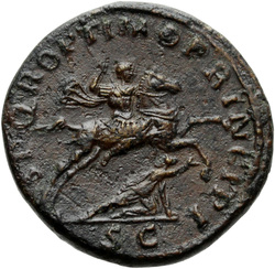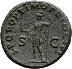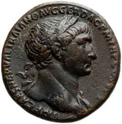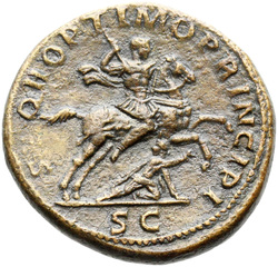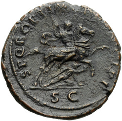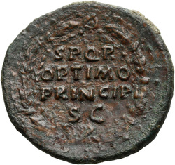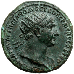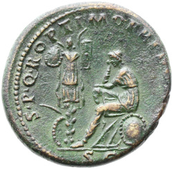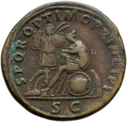 S P Q R [OPTIM]O PRINCIPI S C, Trajan, bare-headed, in military dress, standing left, holding thunderbolt in right hand and vertical spear reversed in left, being crowned by Victory, draped, standing left, holding palm upright in left hand