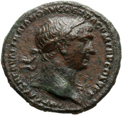 IMP CAES NER]VAE TRAIANO AVG GER DAC [P M TR P] CO[S V P P], Bust of Trajan, laureate, draped on left shoulder, right