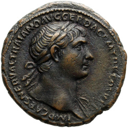 IMP CAES NER]VAE TRAIANO AVG GER DAC [P M TR P] CO[S V P P], Bust of Trajan, laureate, draped on left shoulder, right