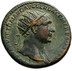 IMP CAES NER]VAE TRAIANO AVG GER DAC [P M TR P] CO[S V P P], Bust of Trajan, laureate, draped on left shoulder, right