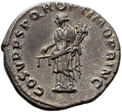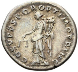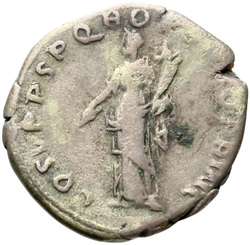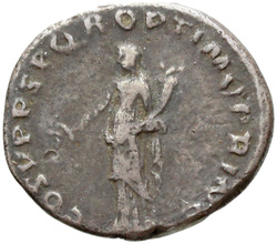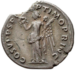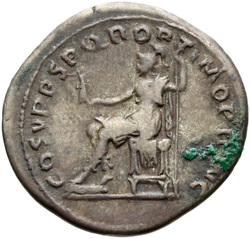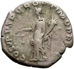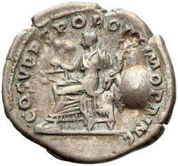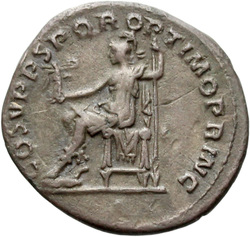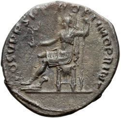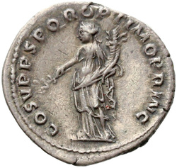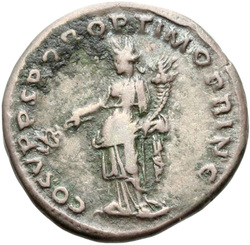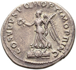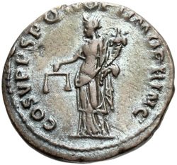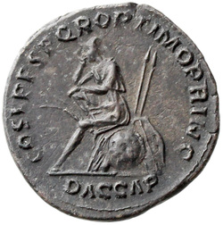 COS V P P S P Q R OPTIMO PRINC, Roma, helmeted, in military dress, seated left, holding Victory on extended right hand and straight spear in left