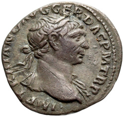 IMP TRAIANO AVG GER DAC P M TR P, Bust of Trajan, laureate, draped on left shoulder, right