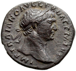IMP TRAIANO AVG GER DAC P M TR P, Bust of Trajan, laureate, draped on left shoulder, right