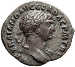 IMP TRAIANO AVG GER DAC P M TR P, Bust of Trajan, laureate, draped on left shoulder, right