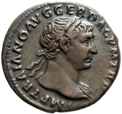 IMP TRAIANO AVG GER DAC P M TR P, Bust of Trajan, laureate, draped on left shoulder, right