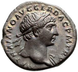 IMP TRAIANO AVG GER DAC P M TR P, Bust of Trajan, laureate, draped on left shoulder, right