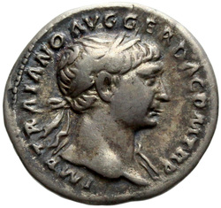 IMP TRAIANO AVG GER DAC P M TR P, Bust of Trajan, laureate, draped on left shoulder, right