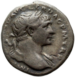 IMP TRAIANO AVG GER DAC P M TR P, Bust of Trajan, laureate, draped on left shoulder, right