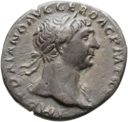 IMP TRAIANO AVG GER DAC P M TR P, Bust of Trajan, laureate, draped on left shoulder, right