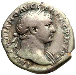 IMP TRAIANO AVG GER DAC P M TR P, Bust of Trajan, laureate, draped on left shoulder, right