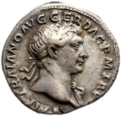 IMP TRAIANO AVG GER DAC P M TR P, Bust of Trajan, laureate, draped on left shoulder, right