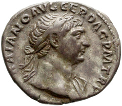 IMP TRAIANO AVG GER DAC P M TR P, Bust of Trajan, laureate, draped on left shoulder, right