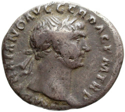 IMP TRAIANO AVG GER DAC P M TR P, Bust of Trajan, laureate, draped on left shoulder, right