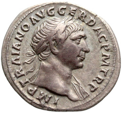 IMP TRAIANO AVG GER DAC P M TR P, Bust of Trajan, laureate, draped on left shoulder, right
