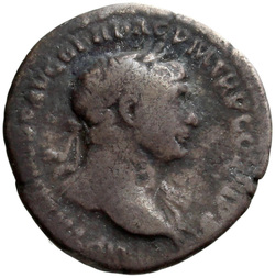 [I]MP TRAIANVS AVG GER DAC P M TR P COS VI P P, Bust of Trajan, laureate, draped on left shoulder, right