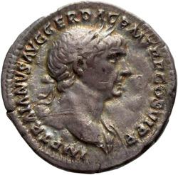 [I]MP TRAIANVS AVG GER DAC P M TR P COS VI P P, Bust of Trajan, laureate, draped on left shoulder, right