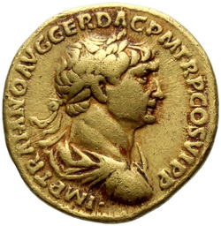 [I]MP TRAIANVS AVG GER DAC P M TR P COS VI P P, Bust of Trajan, laureate, draped on left shoulder, right