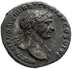 [I]MP TRAIANVS AVG GER DAC P M TR P COS VI P P, Bust of Trajan, laureate, draped on left shoulder, right