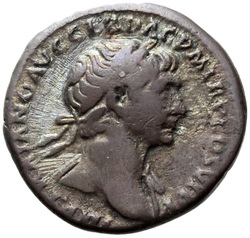 [I]MP TRAIANVS AVG GER DAC P M TR P COS VI P P, Bust of Trajan, laureate, draped on left shoulder, right