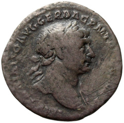 [I]MP TRAIANVS AVG GER DAC P M TR P COS VI P P, Bust of Trajan, laureate, draped on left shoulder, right