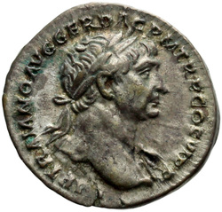 [I]MP TRAIANVS AVG GER DAC P M TR P COS VI P P, Bust of Trajan, laureate, draped on left shoulder, right