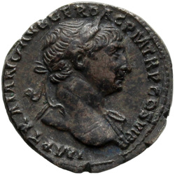 [I]MP TRAIANVS AVG GER DAC P M TR P COS VI P P, Bust of Trajan, laureate, draped on left shoulder, right