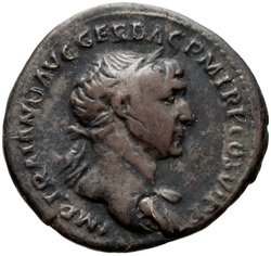 [I]MP TRAIANVS AVG GER DAC P M TR P COS VI P P, Bust of Trajan, laureate, draped on left shoulder, right