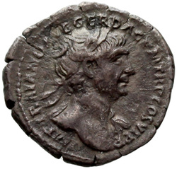 [I]MP TRAIANVS AVG GER DAC P M TR P COS VI P P, Bust of Trajan, laureate, draped on left shoulder, right