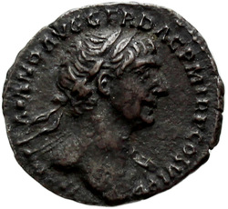 [I]MP TRAIANVS AVG GER DAC P M TR P COS VI P P, Bust of Trajan, laureate, draped on left shoulder, right
