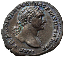 [I]MP TRAIANVS AVG GER DAC P M TR P COS VI P P, Bust of Trajan, laureate, draped on left shoulder, right