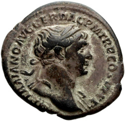 [I]MP TRAIANVS AVG GER DAC P M TR P COS VI P P, Bust of Trajan, laureate, draped on left shoulder, right