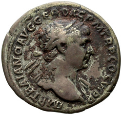 [I]MP TRAIANVS AVG GER DAC P M TR P COS VI P P, Bust of Trajan, laureate, draped on left shoulder, right