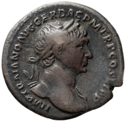 [I]MP TRAIANVS AVG GER DAC P M TR P COS VI P P, Bust of Trajan, laureate, draped on left shoulder, right