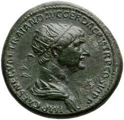 [I]MP TRAIANVS AVG GER DAC P M TR P COS VI P P, Bust of Trajan, laureate, draped on left shoulder, right
