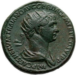 [I]MP TRAIANVS AVG GER DAC P M TR P COS VI P P, Bust of Trajan, laureate, draped on left shoulder, right