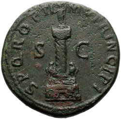 [I]MP TRAIANVS AVG GER DAC P M TR P COS VI P P, Bust of Trajan, laureate, draped on left shoulder, right