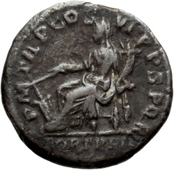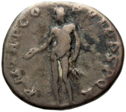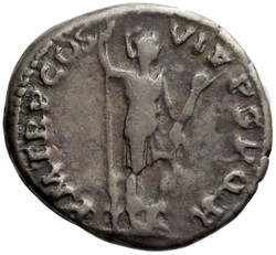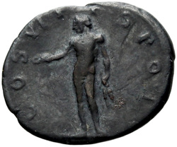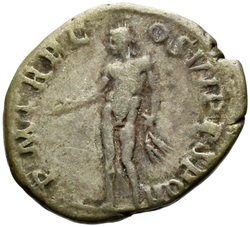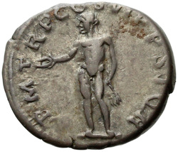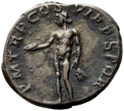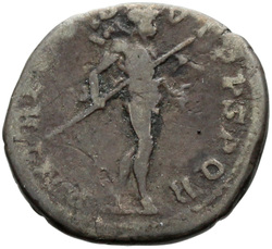 P M TR P [CO]S VI P P S P Q R, Mars, helmeted, naked, except for cloak round waist, advancing right, holding transverse spear in right hand and trophy over left shoulder, in left