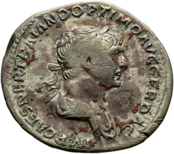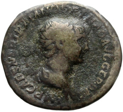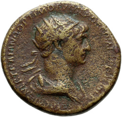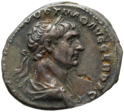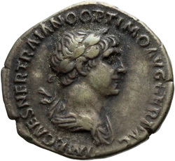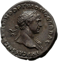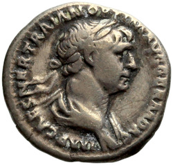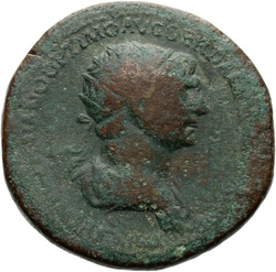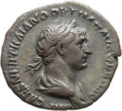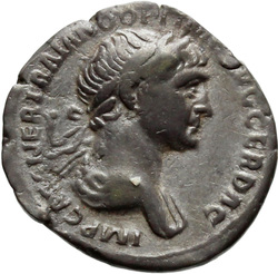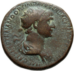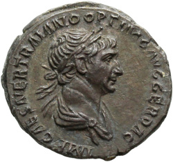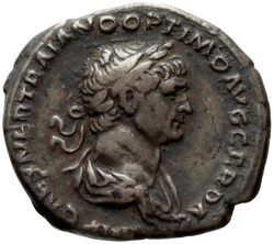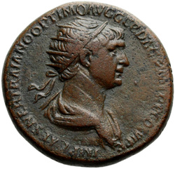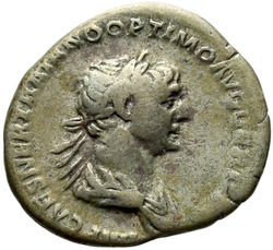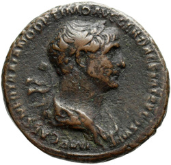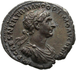 IMP CAES NER TRAIANO OPTIMO AVG GER D[A]C, Half-frontal bust of Trajan, laureate, draped, cuirassed, right