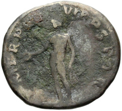 P M TR P COS VI P P S P Q R, Virtus, helmeted, in military dress, standing right, left foot set on helmet, holding vertical spear reversed in right hand and upright parazonium in left