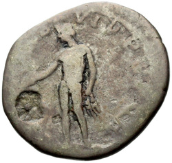 P M TR P COS VI P P S P Q R, Virtus, helmeted, in military dress, standing right, left foot set on helmet, holding vertical spear reversed in right hand and upright parazonium in left