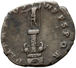 P M TR P COS VI P P S P Q R, Virtus, helmeted, in military dress, standing right, left foot set on helmet, holding vertical spear reversed in right hand and upright parazonium in left