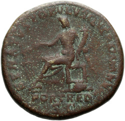 P M TR P COS VI P P S P Q R, Virtus, helmeted, in military dress, standing right, left foot set on helmet, holding vertical spear reversed in right hand and upright parazonium in left