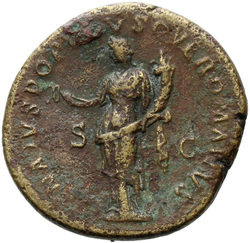 P M TR P COS VI P P S P Q R, Virtus, helmeted, in military dress, standing right, left foot set on helmet, holding vertical spear reversed in right hand and upright parazonium in left